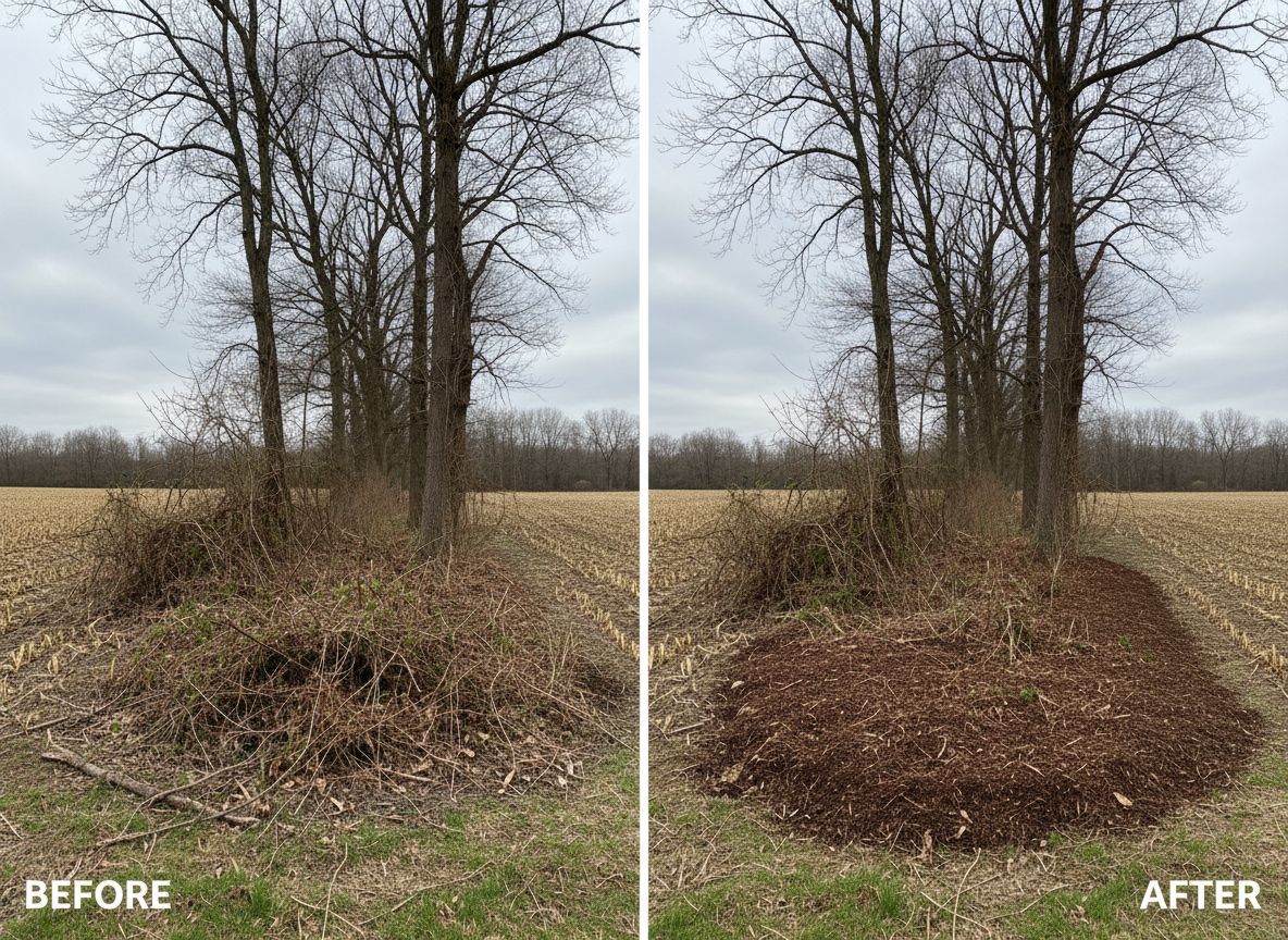 Heavy brush and fallen branches cleared and mulched on-site. Clean, level ground left behind — ready for landscaping, building, or grazing.