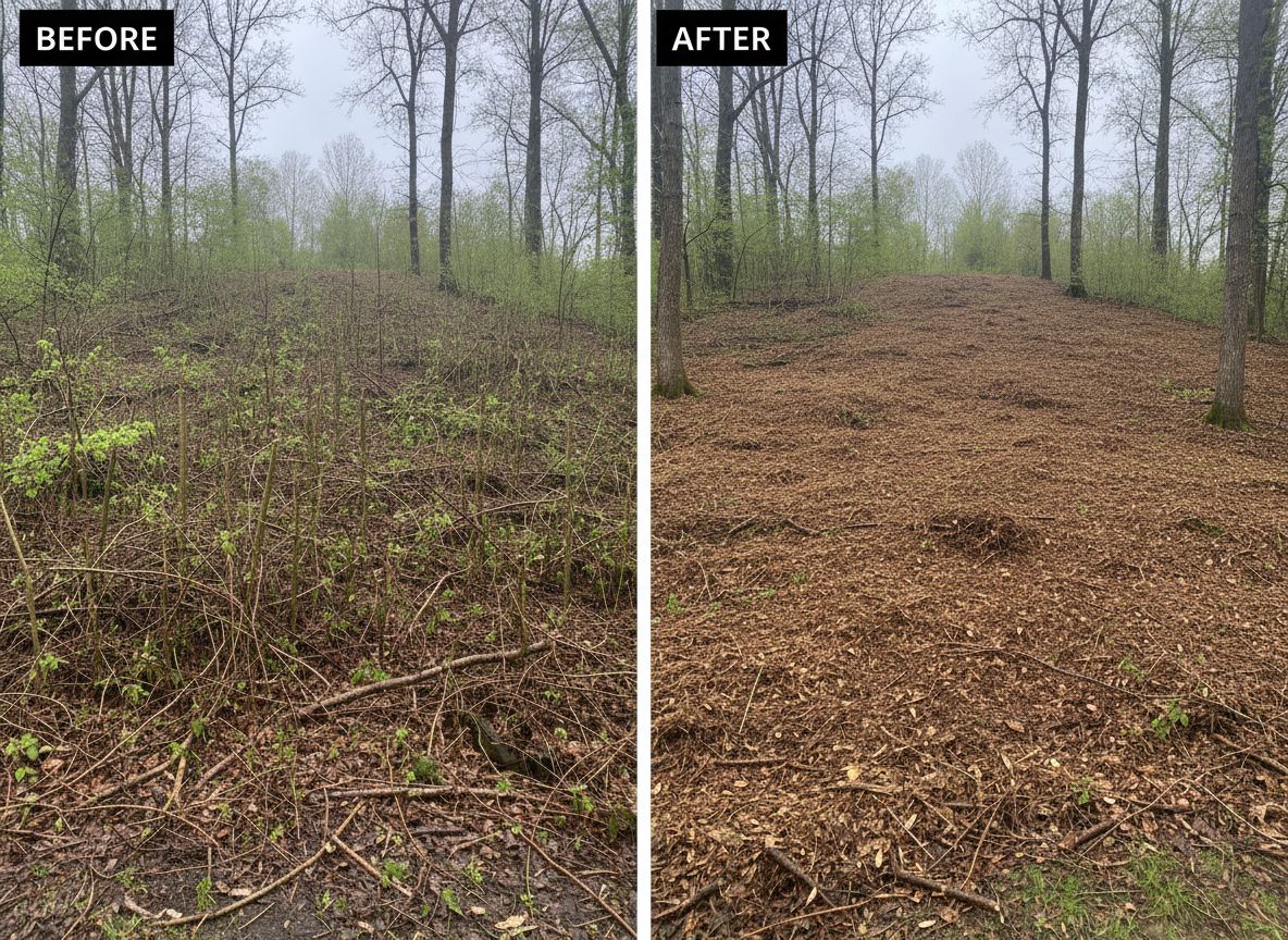 Overgrown brush and tangled undergrowth transformed into a clean, wide trail. Natural wood chip mulch left on the ground — perfect for walking, ATVs, or property access.