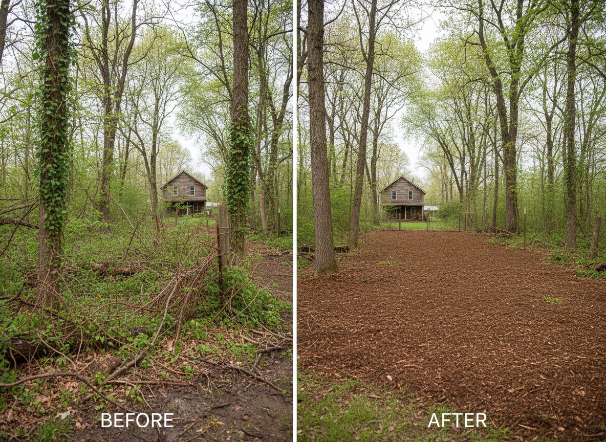 Thick stand of tangled undergrowth, vines, and brush cleared down to clean, mulched ground. Mature trees preserved — land ready for fencing, building, or just enjoying.